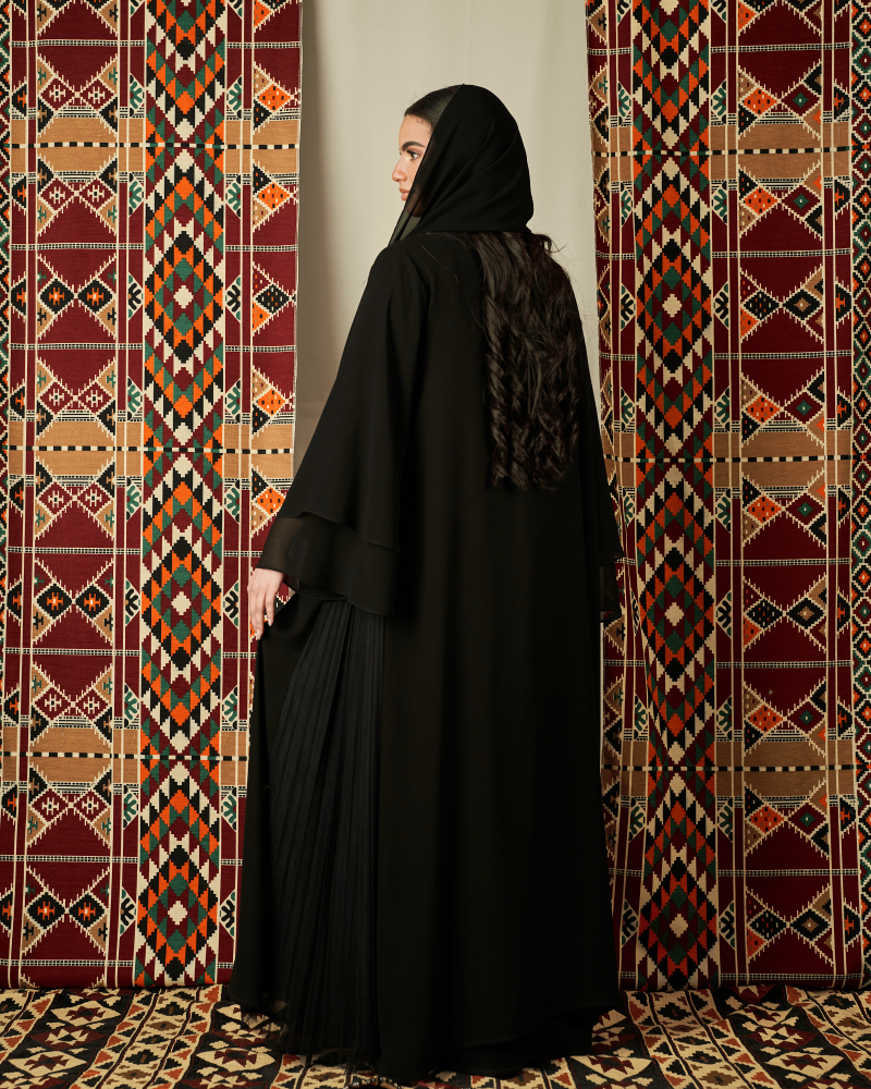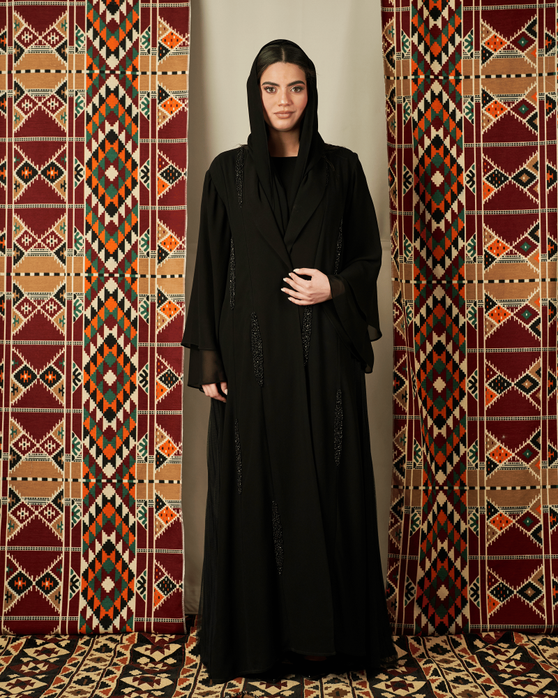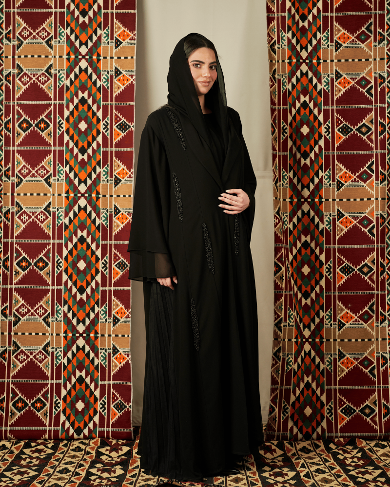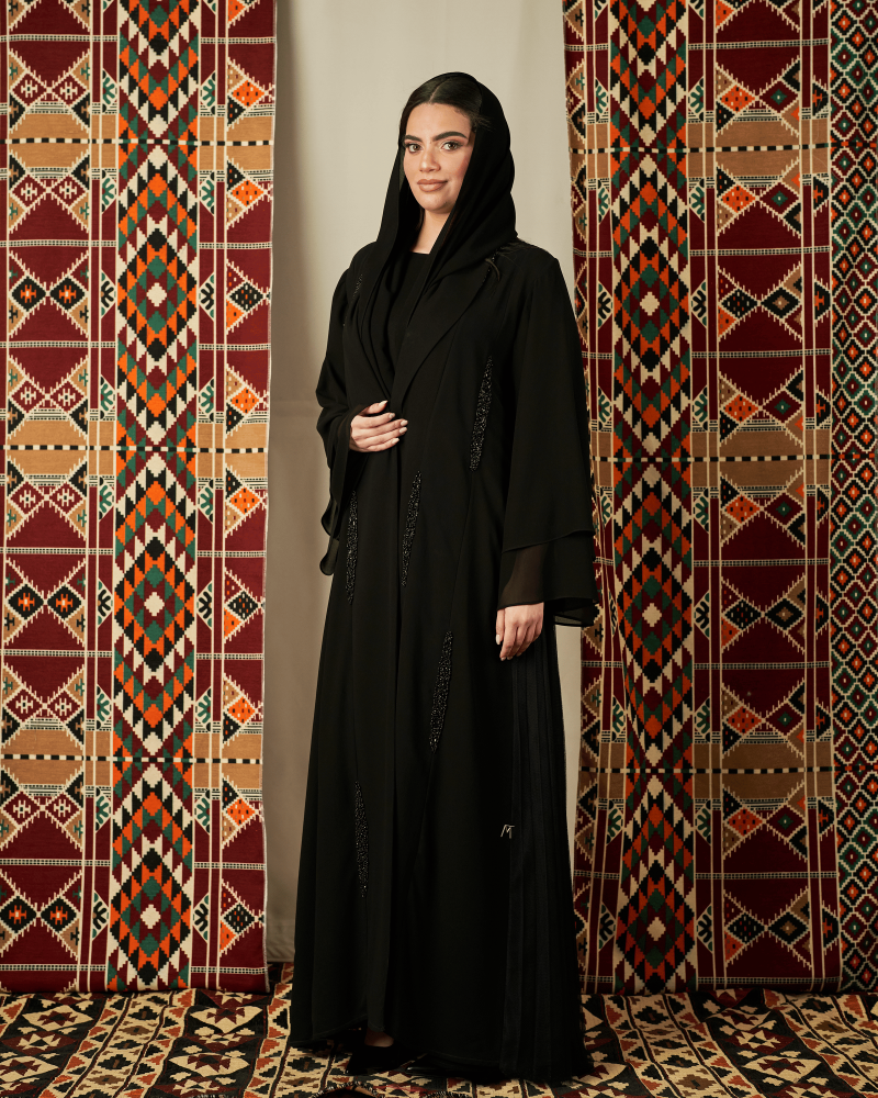 كالسواد المخملي لسماء الليل، تتألق هذه العباية بتفاصيلها الراقية.. شيفون فاخر..مفتوحة بانسيابية، مطرزة بلمسات تعكس وهجك الخاص بأجمل المناسبات.