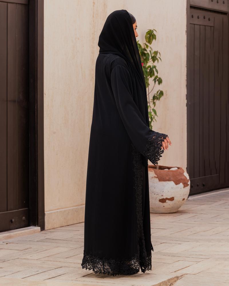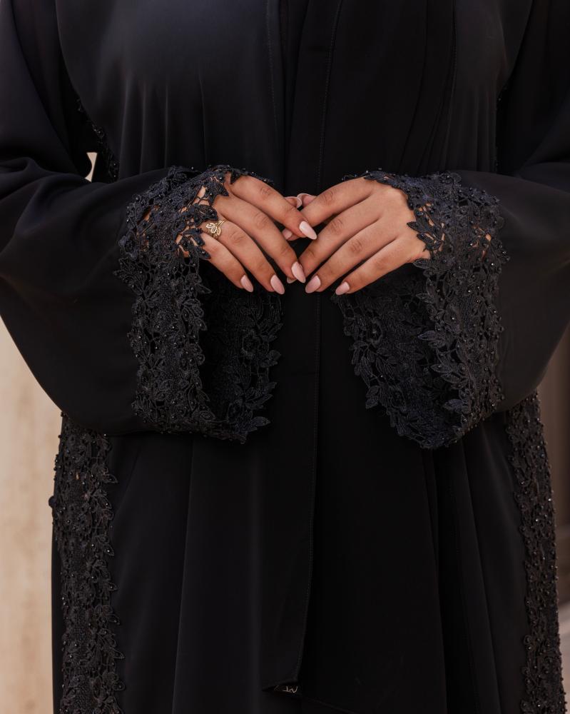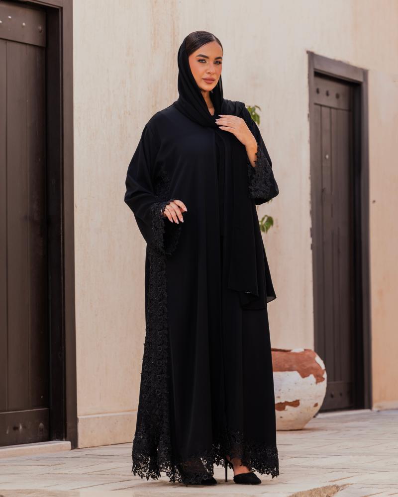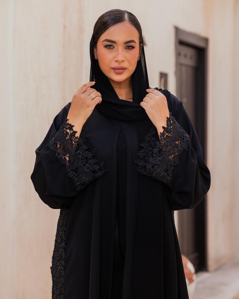 أروع التفاصيل لأرقى إطلالة... عباية سوداء من الكريب الكوري، مزينة بجوبير مطرز يضفي لمسة من الفخامة والأنوثة. تصميم يعكس ذوقك الرفيع ويمنحك إطلالة لا مثيل لها.