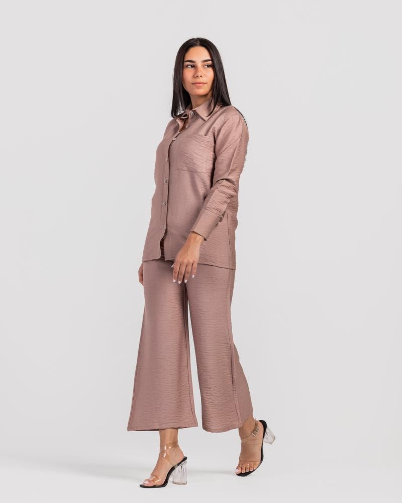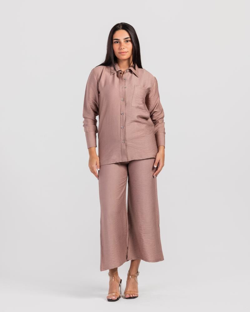 استمتعي بإطلالة متكاملة مع طقم الكتان المكون من قميص بأكمام طويلة وبنطلون متناسق.